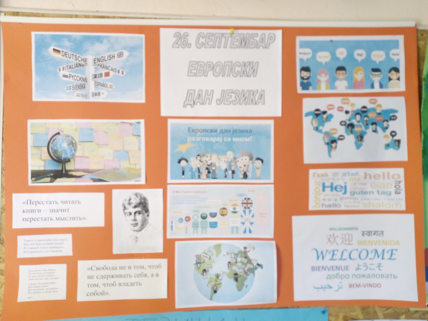 По предлогу Друштва школских библиотекара Србије и Друштва за стране језике Србије, 26. септембра, обележили смо Европски дан језика. Празник који слави језике обележили смо, како у Сакулама, тако и у Баранди: квизовима, презентацијом, песмом и корисним предавањима. Ученици су имали прилике да сазнају који језици броје највише говорника, чули су легенду о настанку страних језика, а одговарали су на питање зашто је важно учити стране језике. Одговори су нам показали да су наши ученици врло свесни значаја језика у комуникацији и превазилажењу језичких баријера. Важност учења страних језика описана је и у нашим народним умотворинама, јер стара изрека каже: „КОЛИКО ЈЕЗИКА ГОВОРИШ, ТОЛИКО ВРЕДИШ!" Европски дан језика