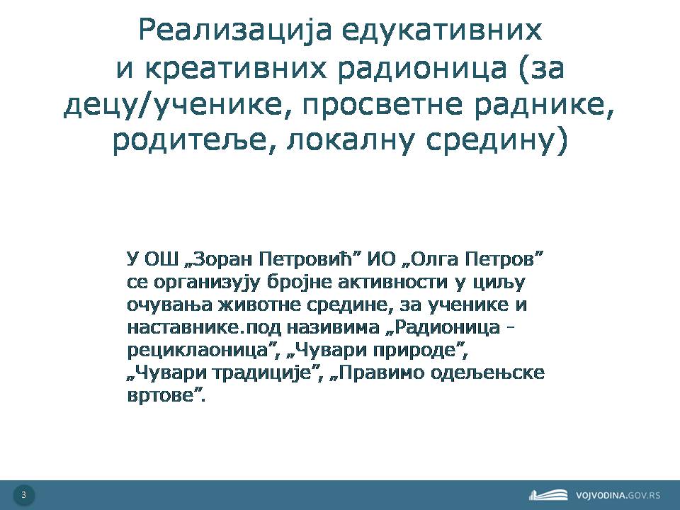 У оквиру вишегодишње, сада већ традиционалне манифестације, „Недеља руског дечијег филма-чаробни свет бајки”, која се одржава у Опову под окриљем Удружења „Србија у срцу - Русија у души” и Националног савета за руску националну мањину, поново је, као и претходних година, одржана едукативна радионица на тему „Васпитни утицај бајке на децу”. Радионица је реализована са свим ђацима ИО „Олга Петров” у Баранди. Учитељица Нада Кљајић је и ове године уз подршку свог колектива одржала радионицу. Циљ овог предавања се састојао у перманентном откривању васпитних сегмената и ситуација из руских бајки, као и у повезивању откривених поука на свакодневни живот. Сви ђаци су одслушали бајку „Маша и медвед”, водили разговор о утисцима које је бајка на њих оставила, а затим су даље по узрасту приступили реализацији нових активности. Најмлађи су добили задатак да цртају, глуме, игроказом са луткама препричају чуту бајку и измене јој крај док су старији ђаци имали за задатак да осмисле нову бајку помоћу предложених смерница, а касније сниме и видео. Смернице за осмишљавање бајки подразумевају везу са екологијом и очувањем животне средине.